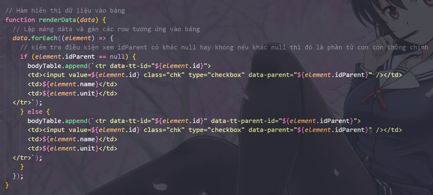 Như cấu trúc dữ liệu của mình sẽ là một mảng chứa các đối tượng và chúng sẽ quan hệ với nhau bằng cặp id và IdParent tức là thằng con chứa id của thằng cha. Dựa vào cấu trúc này chúng ta hãy bắt đầu render các dòng để gắn vào trang html của chúng ta.