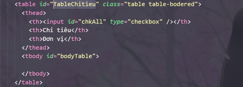Đầu tiên trong file index.html bạn sẽ viết và dòng code đơn giản để tạo ra cấu trức bảng của chúng ta như sau.
