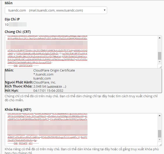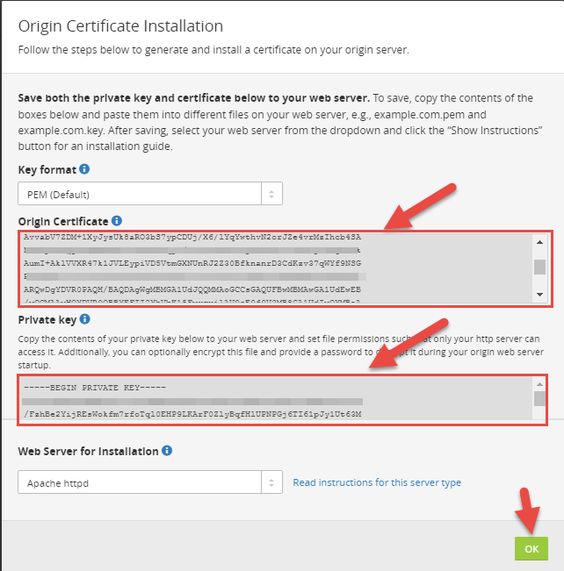 Sau đó bảng Origin Certificate Installation hiện ra. Bạn lưu ý phải lưu lại các đoạn mã hóa Origin Certificate và Private key nhé.