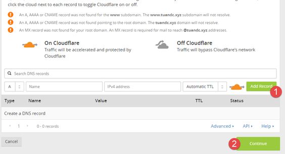 - Sau đó hãy nhập Name và IP host chứa website của bạn, Nhấn Add Record và Chọn Continue để tiếp tục. Bạn có thể thêm các giao thức cho mail, ftp,…