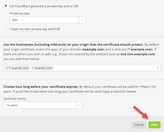 - Ở phần Certificate Hostnames thì bạn cứ nhấn next.