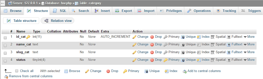 id_cat: có kiểu int, thuộc tính tự tăngAUTO_INC...và nó là trường khóa chính.name_cat: lưu tên của danh mục, có kiểu text.slug_cat: lưu lại tên không dấu, không khoảng cách của danh mục để làm đường dẫn thân thiện sau này.status: đánh dấu trạng thái của danh mục, dùng kiểu tinyint.