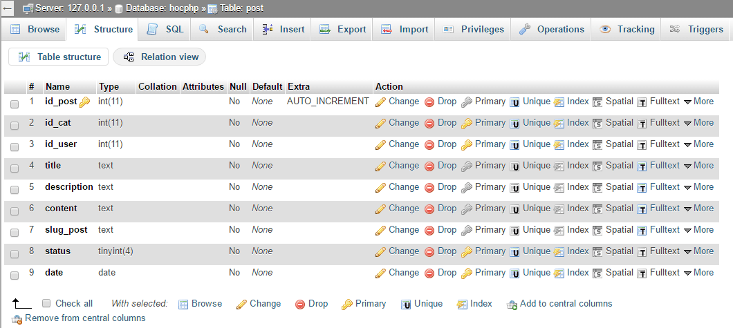 id_post: có kiểu int, thuộc tính tự tăngAUTO_INC...và nó là trường khóa chính.id_cat: id của danh mục. Thật ra thiết kế như thế này chưa hoàn toàn đúng, vì một bài đăng có thể ở trong nhiều danh mục, nên quan hệ của nó là N-N tuy nhiên ở đây mình chỉ thiết kết cơ bản kiểu 1 bài đăng chỉ có 1 danh mục thôi.id_user: id của user tạo bài post.title: tiêu đề của bài postdescription: mô tả của bài postcontent: nội dung của bài postslug_post: tương tựslug_cat.status: trạng thái của bài postdate: ngày đăng bài post.- Mình bổ sung thêm một trường là