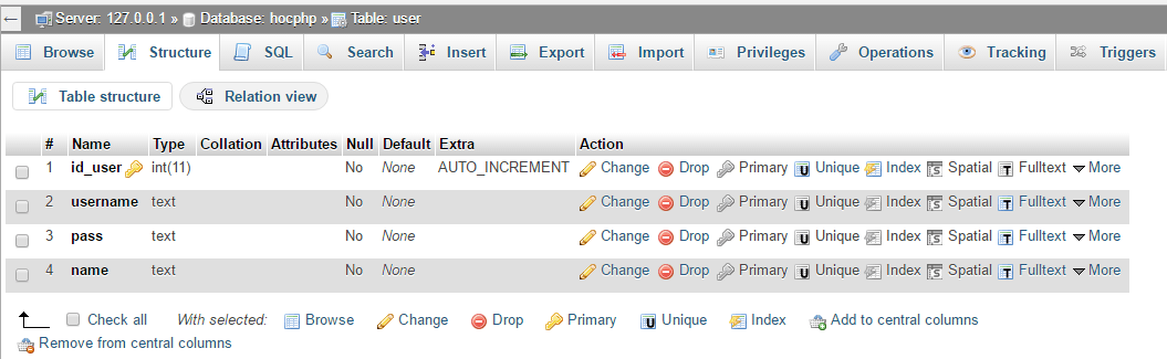 id_user: có kiểu int, thuộc tính tự tăngAUTO_INC...và nó là trường khóa chính.username: sẽ lưu tài khoản đăng nhập của người dùng. Mình để đại kiểu text, bạn có thể để kiểu varchar vì nó thường không chứa dấu và ký tự giới hạn.pass: thì dùng để lưu mật khẩu và mình cũng để tương tự trường username.name: trường để lưu tên của user.
