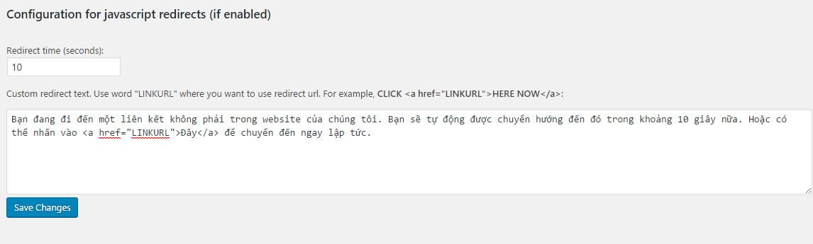 - Link redirect sẽ có dạng http://domain.com/goto/http://domainout.com. Hầu hết link out của mình đều là redirect. Nếu bạn muốn sử dụng thông báo trước khi dẫn đến link của người khác bạn có thể nhấn vào Use Javascript redirect. Sau đó kéo xuống phần cuối và chỉnh sửa lại thời gian tự động chuyển hướng và nội dung thông báo.
