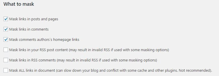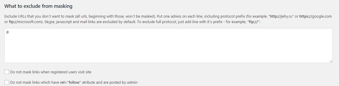 - Thêm các liên kết loại trừ – what to exclude form masking, đây là một trong những tính năng mình rất thích, ví dụ website của bạn là vệ tinh và không muốn plugin này áp dụng gì cả thì có thể thêm vào phần này. Bạn phải thêm cả đầy đủ giao thức ví dụ như https://google.com hoặc là ftp://199.304.303.22,… mỗi liên kết bạn thêm vào trong một dòng. Bên dưới bạn có 2 tùy chọn như không thay đổi các link này với người dùng đăng ký còn những người chưa đăng ký vẫn nhìn thấy link đã bị thay đổi hoặc không thay đổi loại trừ nếu liên kết này có thuộc tính nofollow do chính admin chèn vào.