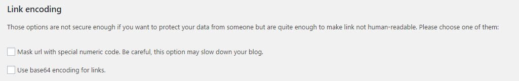 Phần cuối cùng trong plugin này đó là mã hóa liên kết. ví dụ link redirect có dạng https://domain.com/goto/domainout.com sẽ được chuyển thành https://domain.com/goto/1 với 1 là số được mã hóa nếu bạn chọn cái đầu, còn nếu chọn cái thứ 2 nó sẽ mã hóa base64 ví dụ như https://doamin.com/goto/aHR0cDovL0dvb2dsZS5jb20=. Mình khuyên bạn nên chọn cái thứ 2 sẽ tốt hơn rất nhiều do nó không phải mất công tạo bảng trong cơ sở dữ liệu, tránh lỗi khi không tài khoảng database không có quyền tạo bảng.