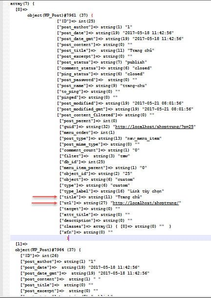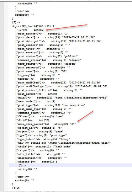 Bên trên là một phần của mảng mà mình show ra bằng hàm var_dump, nhìn cũng hãi thật menu mình chỉ cần cái title và url là đủ thế mà nó làm hẳn mấy chục trường vậy đó. Để làm menu đa cấp bạn cần chú ý thêm 2 trường nữa đó là ID và menu_item_parent. Trường ID là trường để xác định thôi, còn trường menu_item_parent là trường để xem nó là con của thằng nào (con của ID nào).